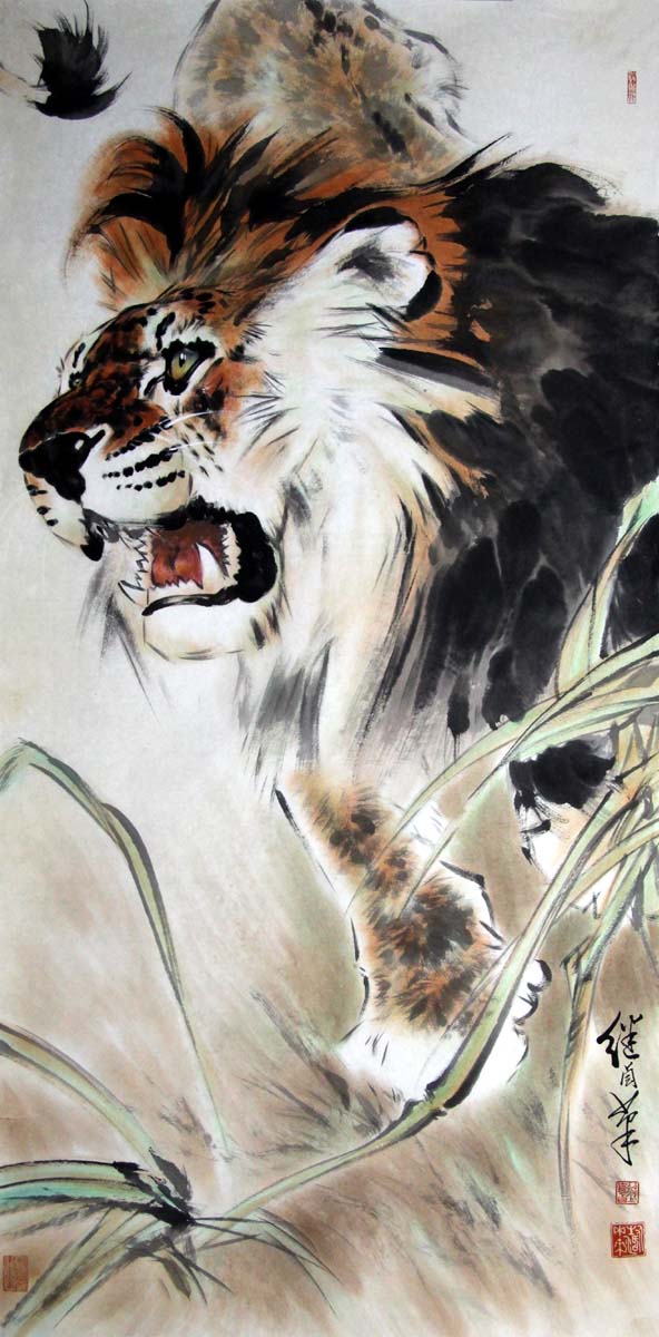 这幅《雄狮图》就是最好的例证,画面上狮头占去二分之一的画幅,以示狮子的威武雄壮,不可侵犯,,特别是作品前端的爪和作品后边的尾遥相呼应,有一种贯穿全局的感觉,增添了形象的动态感,那几笔既简单又流畅的草,凸显了环境气氛,为作品争色不少。虽说画家没有追求狮子的躯体的完整,但由于处理得当,丝毫没有残缺感,这无疑是画家绘画功底所致。