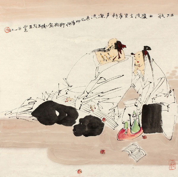 沙洲之上,一老者望江抚琴,一书童静心闭目倾听,琴者若有所思,听者全神贯注,这就是王西京全译“江歌一曲随波去,更有新声逐波来”意境的一幅写意人物画。