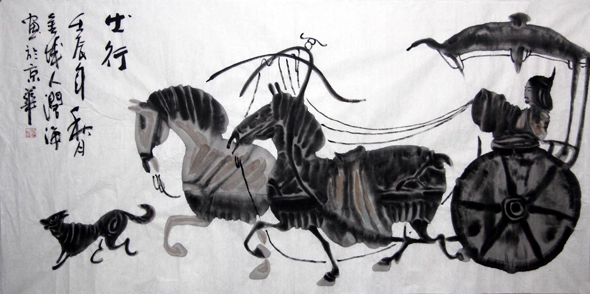 从这幅水墨画中我们似乎看到了有很多其他艺术元素在里边,如马的外型就有唐三彩影子,物象处理与民间皮影有共同之处,既有浮雕的效果,又有壁画的特征,无疑是借助了汉画的形式,重新塑起的艺术形象和艺术生命。