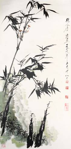这幅《竹鸟图》,画家以写意手法,写竹画鸟,其竹富有灵动脱俗之感,其鸟彰显自然和谐之味,还有处于画面明显位置的两棵笋,不但为竹起到了很好的衬托作用,也为画面带来了生机。