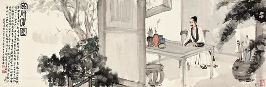 2016年12月5日,北京匡时国际拍卖十周年秋季拍卖在北京国际酒店拉开战幕,在“澄怀-中国书画夜场”中,本场最高估价拍品--傅抱石1948年的《宝研楼图》以 2500万起拍,最终以4400万的价格落槌,含佣金成交价为5060万,拍前估价为2800万-3500万,尺寸为35×106cm。在艺术市场还未回暖之前,傅抱石作品拍出这样的价格,俨然成为市场的硬通货。 《宝砚楼图》系画家于1948年初为友人所作。图中有款云:“戊子春月蔡君慕慈携莱公先生手翰见示,属写宝砚楼图卷。”蔡慕慈系傅氏同乡及好友。求画者“莱公”名钱公莱,其人富收藏、精鉴赏,故傅氏对其求画“敬申欣然之忱”,且精心构思创作此帧《宝砚楼图》。图中无论门窗桌椅,书画摆设,及端坐室中之“宝砚楼主”,室外之栏杆树丛,行笔皆简洁明快而又轻松潇洒,可谓典型之傅氏风格。尤其是画中那把玩宝砚之“楼主”,面容略显清癯而神清气朗,眉宇间有凛然之气,一望而知为性情孤傲而又饱学诗书之士。画古代人物既能画出“古意”,又能画出人物之个性,这正是傅抱石人物画之一大特色。 此图无论景物布局之巧妙,人物安排之得体,均可见画家曾苦心经营,堪称傅氏人物画中难得之佳构。故上海古籍出版社出版之《傅抱石年谱》及台湾羲之堂为傅抱石百年纪念而出版之《傅抱石的世界》均将该画收录其中。 傅抱石先生所绘的横幅画作颇为稀见,即偶有传世者也多为其四十年代后期尺幅较大的作品。如本幅写于四八年兼属精致的小横幅,可谓稀若星凤,若非交谊相当,恐亦难出其笔下。上款人钱公莱为由京沪区铁路管理局局长,傅抱石四十年代所精心撰写的《石涛上人年谱》由京沪铁路管理局发行出版,此幅作品亦于此时受钱公莱先生所请制成,同时期内郑午昌、溥心畬及余绍宋等均为其创作过《宝研楼图卷》。携函者蔡慕慈,亦供职于政府,抗战时期,其母及妻子在渝均交托傅抱石照顾。与傅氏一家相处颇长日子,故交谊匪浅,钱莱公并经他的关玒与傅氏结识。