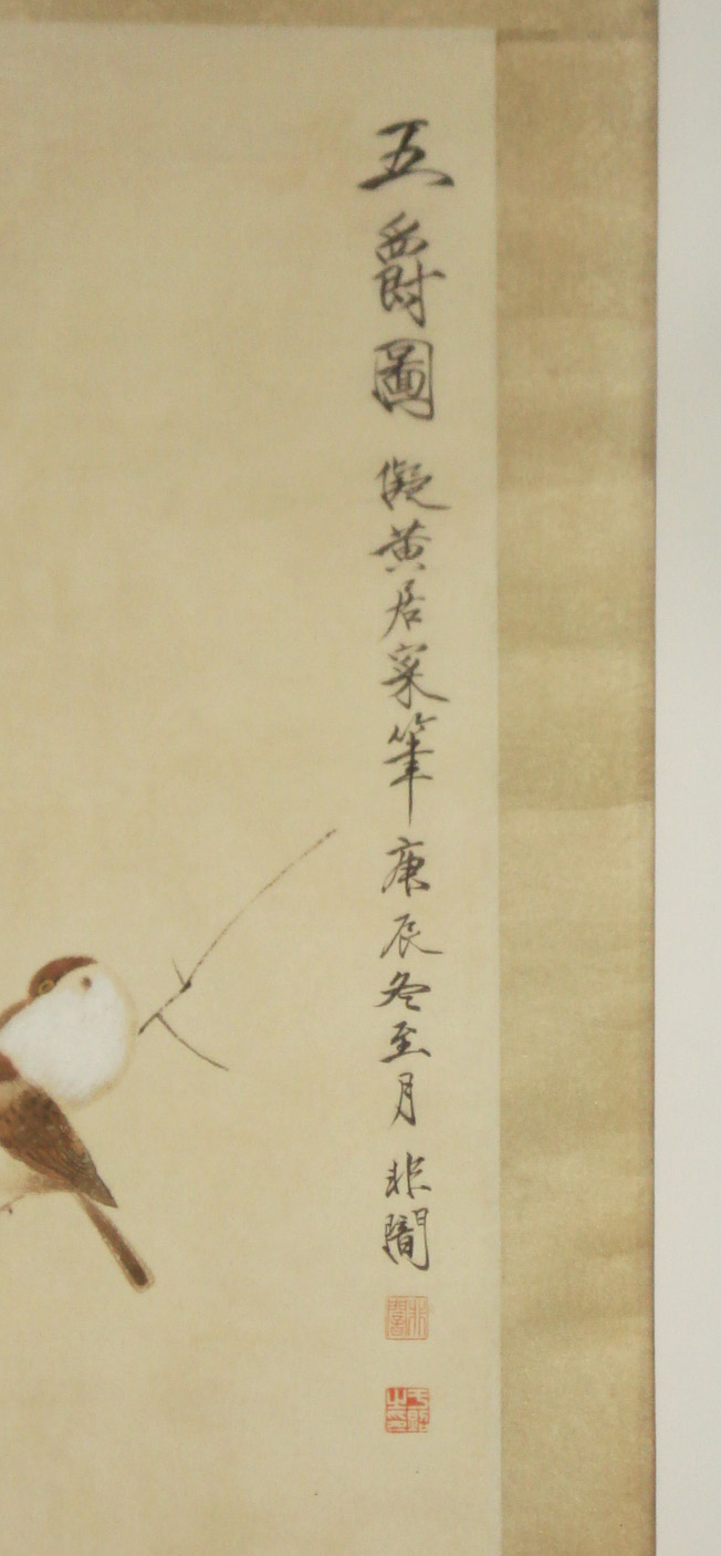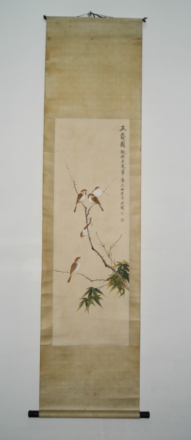 于非闇(1889年3月22日—1959年7月3日)中国画家。原名于魁照,后改名于照,字仰枢,别署非闇,又号闲人、闻人、老非。原籍山东蓬莱,出生于北京,自幼得书画家传。1912年入师范学校学习,后任教于私立师范校、私立华北大学美术系。兼任古物陈列所附设国画研究馆导师。1935年起专攻工笔花鸟画。1949年后历任中央美术学院民族美术研究所研究员、北京中国画研究会副会长、北京画院副院长。作品有《玉兰黄鹂》、《丹柿图》、《牡丹鸽子》等。著有《非闇漫墨》、《艺兰记》、《中国画颜料研究》、《我怎样画花鸟画》。 尺寸:98厘米x33厘米.一幅老裱.有意的联系.电话:13718331060