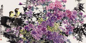 (1943.11—) 福建莆田人。,早年得岭南派名家宋省予、陈子奋的悉心教诲,并勤心研习撞粉、撞水的岭南花鸟画风,临摹学习虚谷、郑板桥、任伯年、吴昌硕及齐白石的绘画技巧,66年“文革”开始,就拜著名版画家修军学习版画艺术,创作出许多国内外具有影响力的优秀作品作为。1987年调到长沙市文联,开始有了从事自己多年来探求、创新花鸟画的实践。对于一个真正的艺术家来说,时代的变迁和生活的跌宕起伏并不会给其带来愤懑和消沉,他们用其固有的执着和探索、捕捉和创造来体现心灵的颤动和时代的气息。柯桐枝的画正如他人一样乐观、开朗、活跃,充满灵动之气。花鸟画的创作方面,从“以墨为主”“留白抒意”的传统国画观念中跳出来,增添版画刀刻手法与油画的缤纷色彩相结合,使“骨法用笔”与丰富的色彩发挥无限的艺术意境的想象空间,以色压色、以色衬色,使作品集热烈、隆重和高雅、明快一体的几乎唯美的艺术效果,以体现物我互融、互解、互爱、互扬的花鸟自然观。他坚持以理会形,以意取神,以我法变古法,变古意为今情,用大块的墨、靓丽的色彩、繁密紧凑的构图、刀凿般弹性有力的线条、速写般潇洒随意的走笔落款,有机构成了画面的冲力动感,给作品赋予了勃勃生机,呈现出鲜明的艺术特色和时代意识。这是一种满怀激情的自然观,全然不是传统的清淡和虚隐,一改传统文人的文弱和孤傲,充满激情地走入绚丽缤纷的现实生活。更加体现大自然的缤纷色彩和富丽庄重。才能使中国的传统花鸟画有足够的力量和宏大的气魄走入绚丽缤纷现实生活之中,在同样绚丽缤纷的当代艺术之林中占有一席之地。柯桐枝的花鸟画重视传统观念和表现手法的创新,主张花鸟画家要画心中之花、意中之鸟,求艺术精神之美,用自己明净、宽阔的内心世界去感悟和亲近自然。