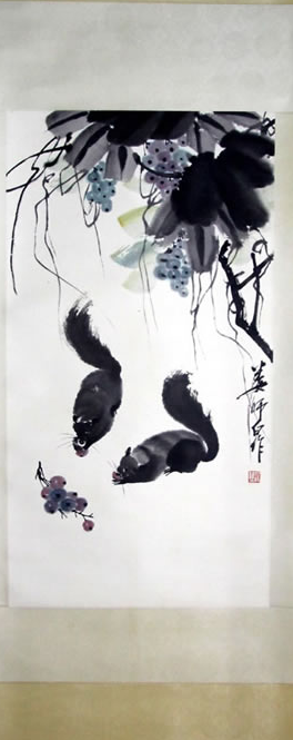 薛大庸的这幅画画中描绘的松枝劲挺,结构分明,双鼠逼真,动态自然。从笔墨风格上看,技法古朴高明,个人画风明显,整体格调清秀自然。双鼠描绘不失优美生动的神态和情趣,把两只松鼠伶俐活泼的性格刻画得精细入微,看起来像小孩子一样可爱。它们一上一下匍匐在松枝上,仲着脑袋,瞪着圆面大的贪欲的眼睛,似在寻找充饥的食物,竖立的双耳,嗅着气味的鼻翼,肥胖的身子攀在松枝上,点出了深秋季节的气息。灵一幅松鼠迷失的场景活灵活现的跃入我们眼前。非常适合作为客厅挂画。