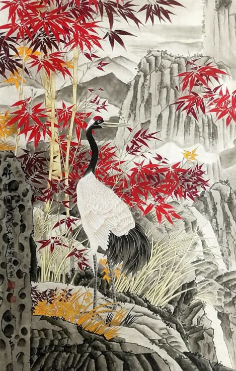 王文强笔下的这只公鸡威武雄壮,外观大气漂亮,尤其是高耸火红的鸡冠,惟妙惟肖。竹子的刻画也是神笔之作,用细腻的技法将竹子点缀出来。竹叶虽寥寥数笔却极富含层次感,奇石坐落其间,金鸡傲然独立在奇石之上,于风中之姿流露出一股蓬勃向上的生机灵性感,全面生动自然,富有情趣。这幅画四尺竖幅动物画《竹报平安大吉大利》堪称精品之作。