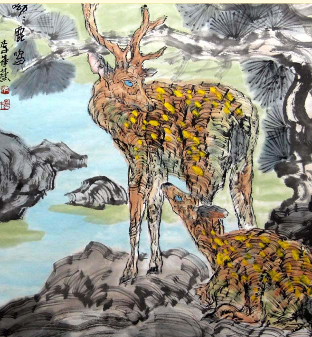 两只梅花鹿,一立一卧,姿态安详,家庭和谐美满、福禄双来成对;两株古树,苍松赤枫,轻描隐缀,有着长长久久、红红火火之意。